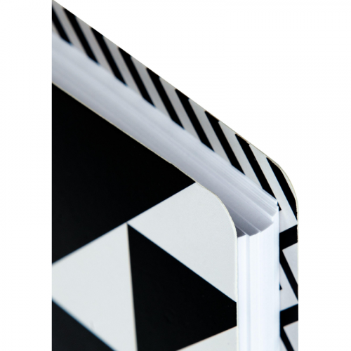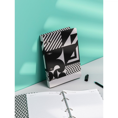 Ежедневник формата A5 недатированный с авангардным черно-белым рисунком 140x195 мм, 136 листов, блок в 1 краску - удобный и незаменимый помощник для внесения необходимых записей и планирования. Мягкая обложка из картона с отделкой из глянцевой ламинации со скругленными углами листа. Внутренний блок выполнен из белой бумаги высокой плотности 80г/кв.м, крепление - на кольцах, вид линовки - линейка. Содержит информационно-справочный блок. Нет петли под ручку.