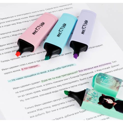 Набор текстовыделителей MESHU Neko с пастельными чернилами на водной основе – универсальные канцелярские принадлежности в оригинальном дизайне. Скошенный наконечник позволяет регулировать толщину линии письма от 1 до 5 мм, за счёт чего изделия подходят для выделения большинства шрифтов. Благодаря классической форме корпуса текстовыделители удобно держать. Длина линии письма достигает 200 м. Цвет колпачка и корпуса соответствует цвету чернил. Текстовыделители упакованы в ПВХ-бокс с европодвесом по 4 шт. • Количество цветов: 4; • Ширина линии: 1/5 мм; • Упаковка: ПВХ-бокс с европодвесом.