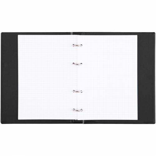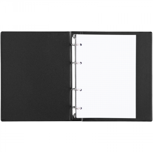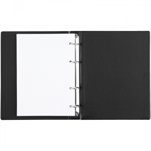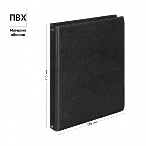 Тетрадь на кольцах BG формата А5 (215*170 мм) – незаменимый помощник в офисе и учёбе и отлично подходит для большого объёма записей. Внутренний блок – это 80 листов, офсетная бумага плотностью 60-65 г/м², белизна - 100 %, линовка – клетка. Цвет бумаги блока - белый. Тетрадь имеет кольцевой механизм для быстрой смены или добавления листов, состоящий из 4 колец. Обложка изготовлена из ПВХ с прямым корешком и выполнена в черном цвете. Тетрадь упакована в пакет.