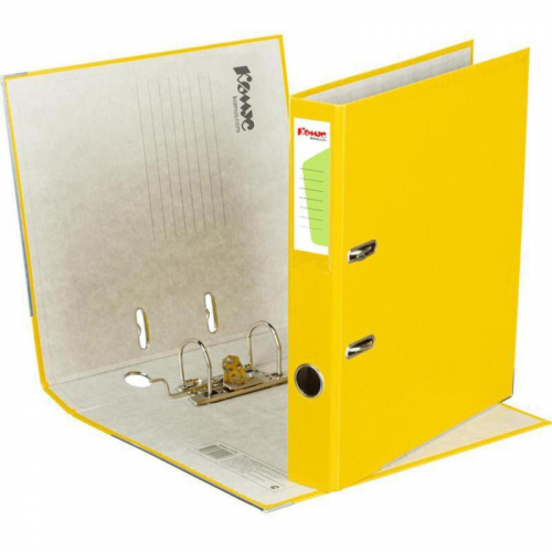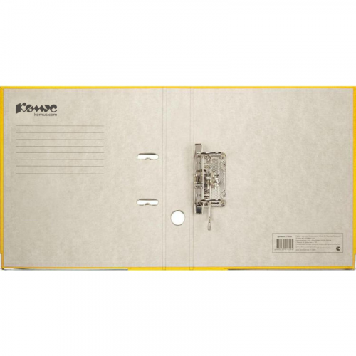 Папка-регистратор 'Комус' из коллекции 'Экономи' подходит для хранения большого количества документов в офисе, государственном учреждении и дома. Формат А4. Изготовлена из плотного картона, покрытого бумвинилом желтого цвета. Внутренняя вклейка бумажная, предусмотрено поле для записей. Арочный механизм произведен в Чехии. Нижние края папки защищены от повреждений металлическим кантом. На корешке шириной 50 мм есть карман со сменной этикеткой и кольцо для захвата. Благодаря прорезям для колец на внешней крышке папка-регистратор 'Комус' остается закрытой даже при большом количестве бумаг. Папка вмещает до 350 листов. Размер кармана на корешке папки может быть разным в зависимости от производителя папок. Цвет папки может быть более насыщенным или более светлым в зависимости от производителя папок. Законодательные и технические документы