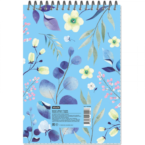 Блокнот Attache Цветы - блокнот формата А5 для ведения записей. Состоит из мягкой картонной обложки в красочном стиле и 60 листов офсетной бумаги. Листовая бумага у данного блокнота имеет белый цвет. Она разлинована 'в клетку'. Плотность блока равна 60 граммам/квадратный метр. Листы надежно крепятся с обложкой с помощью спирали, крепление располагается сверху. Блокнот не имеет перфорации и разделителей, а также фиксирующей резинки, отверстия для прошивки и полей для подписи на обложке. Общий габариты блокнота составляют 146х204 миллиметров. Дизайн блокнота Attache Цветы выполнен в голубом цвете с изображением нежных цветов. Данный блокнот станет идеальным выбором для учебы, офисных будней или же просто как личный ежедневник. Законодательные и технические документы