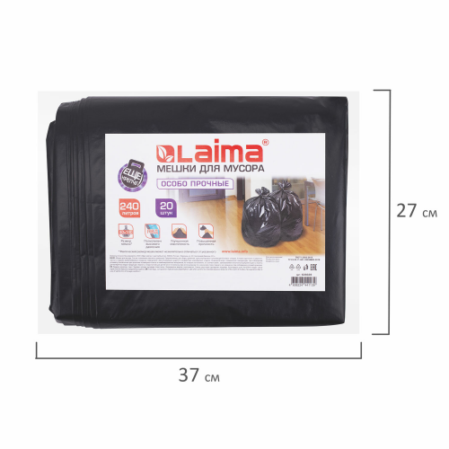 Мешки для мусора 240л черные в пачке 20шт ОСОБО ПРОЧНЫЕ, ПВД 60 мкм, 90х140см, LAIMA, 609339