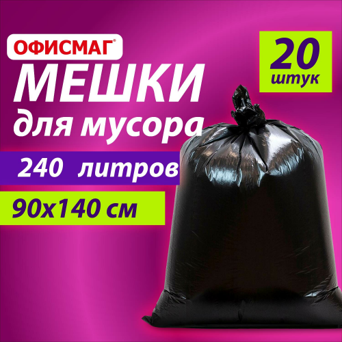 Мешки для мусора 240л черные в пачке 20шт ОСОБО ПРОЧНЫЕ, ПВД 60 мкм, 90х140см, ОФИСМАГ,609340