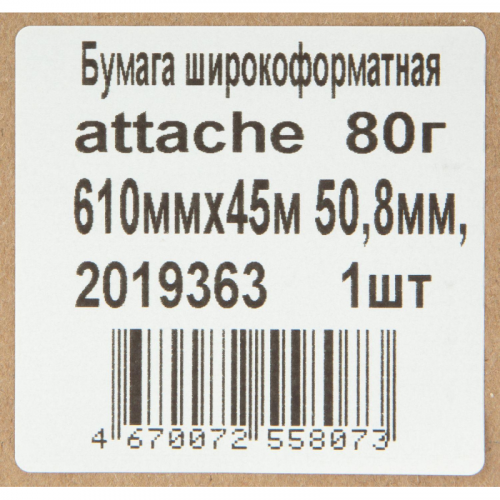 Широкоформатная бумага Attache, предназначенная для печати технической документации, инженерной и деловой графики. Совместима со струйными черно-белыми плоттерами и принтерами НP, Сanon, Еpson, Xerox. Бумажное полотно белизной (138%) имеет размер 610 мм, что соответствует формату А1. Защитная полиэтиленовая пленка на упаковке сохраняет форму рулона и позволяет поддерживать нормальный уровень влажности. Длина рулона - 45 м. Внешний диаметр рулона - 9,5 см.