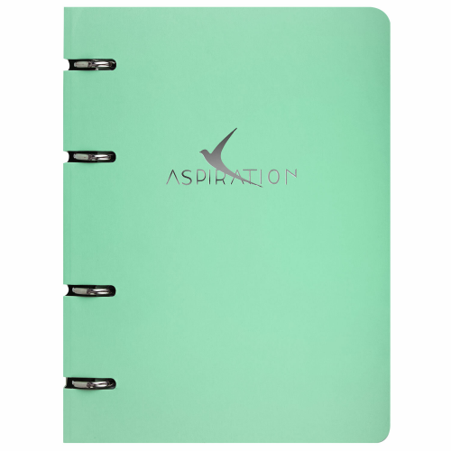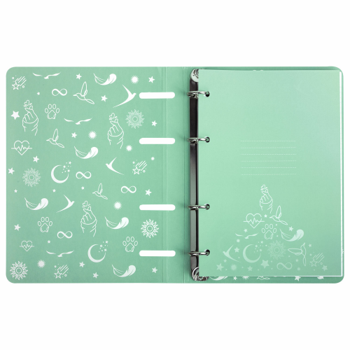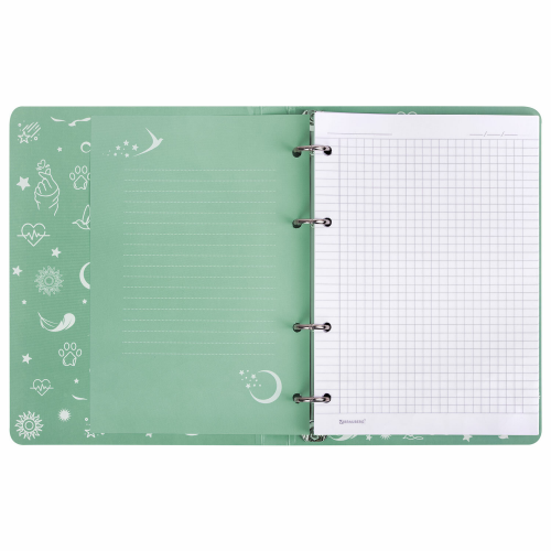 Блок состоит из 120 листов офсетной бумаги белого цвета плотностью 60 г/м2. Линовка – клетка. Обложка выполнена из плотного слим-картона с высечкой под кольцевой механизм, имеет цветной форзац и покрытие матовой пленкой с тиснением фольгой. Формат А5 является стандартным, поэтому тетрадь удобно носить в рюкзаке/ранце или папке.