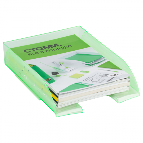 Лоток горизонтальный "СТАММ" серии "Вега" предназначен для хранения бумажной продукции формата А4. Лёгкий, прочный и устойчивый корпус изготовлен из качественного пластика. Боковые стенки лотка дополнены оригинальным узором. Предусмотрена возможность установки одного лотка на другой. Изделие высотой 67мм, глубиной 330мм и шириной 250мм вмещает до 400 листов. Цвет — тонированный неоновый зеленый.