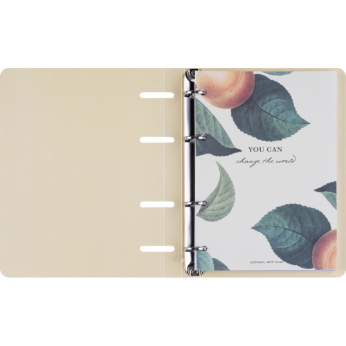 Тетрадь на кольцах со сменным блоком Be Smart Flora А5 120 листов с рисунком в клетку с перфорацией, матовая ламинацияТетрадь формата A5 (163x212 мм) с кольцевым механизмом - это стильный и функциональный аксессуар для записей. Её дизайн, сочетающий элементы живописного Прованса и ретро, придаёт тетради уникальный эстетический вид, который стимулирует творчество и вдохновение.Обложка выполнена из мелованного картона плотностью 500 г/кв.м с ярким цветным принтом персиков и тиснением фольгой, а также покрыта матовой ламинацией, что придаёт ей прочность и долговечность. Скруглённые уголки обложки защищают её от повреждений и сохраняют её внешний вид при хранении в сумке или рюкзаке. Кольцевой механизм позволяет легко добавлять и удалять листы, а также вставлять дополнительные блоки или разделители для удобной организации.Внутренний блок состоит из 120 листов (240 страниц) белой офсетной бумаги плотностью 65 г/кв.м с клеточной линовкой и серыми линиями. Листы имеют прямые уголки и белизну 100%, а блок включает титульный лист. Размер листа - 14x20 см.