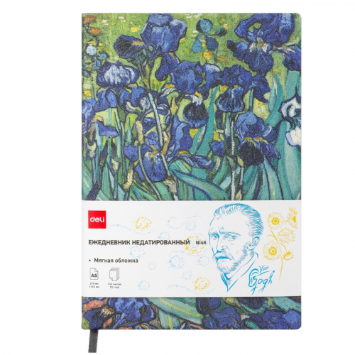 Ежедневник недатированный Deli VG формата A5 без полей с красивым дизайном. Ежедневник Deli - это прекрасный деловой атрибут для ежедневного ведения записей о делах, планах и для других заметок. Он будет не только незаменимым помощником в записи лекций или уроков, а также для важных событий! Используется для письма шариковыми, гелевыми и капиллярными ручками. Обложка Ван Гог 'Ирисы' из высококачественного износостойкого материала поможет надолго сохранить привлекательный внешний вид ежедневника. Ван Гог считается одним из величайших художников мира, его работы оказали огромное и далеко идущее влияние на искусство 20-го века, а также до сих пор остаются визуально и эмоционально сильными. Мягкая, но плотная обложка не даст помяться ежедневнику в рюкзаке и защитит записи от дождя. Ежедневник отпечатан на современном высокотехнологичном оборудовании и соответствуют стандартам качества. Качественная текстура бумаги, светло-кремового цвета. Надежный прошитый переплет. Эргономичный размер позволит ежедневно держать их всегда под рукой и делать оперативные заметки в любой ситуации. Скругленные уголки помогут надолго сохранить привлекательный внешний вид, а также случайно не пораниться. Формат: A5. Количество листов: 136 листов. Размер: 143x210 мм. Тип скрепления: декоративная нить. Тип ежедневника: недатированный. Цвет: синий.