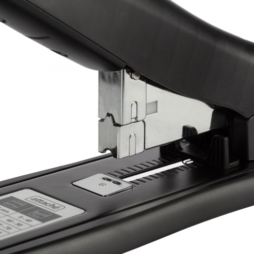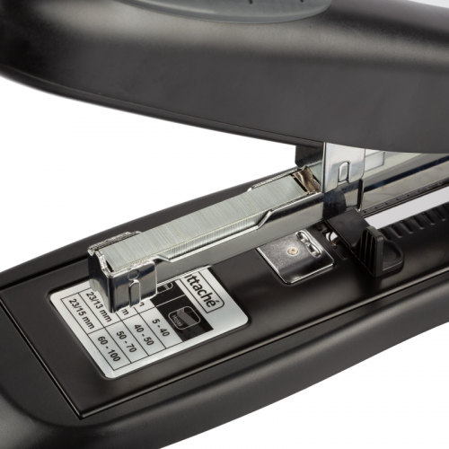 Мощный степлер с максимальной толщиной сшивания бумаги до 100 листов. Глубина закладки листов составляет 60 мм. Основа степлера, выполненная из металла, пластика и резины, не царапает поверхность стола и предотвращает скольжение. Тип и размер используемых скоб: N23/6, 23/8, 23/10, 23/13. Загрузка скоб в степлер осуществляется фронтально. Для эффективного сшивания максимально допустимого объема бумаги необходимо расположить степлер на горизонтальной твердой поверхности, прикладывая усилия, плавно надавить на рычаг (при необходимости двумя руками), разномерно распределяя усилия по поверхности рычага.