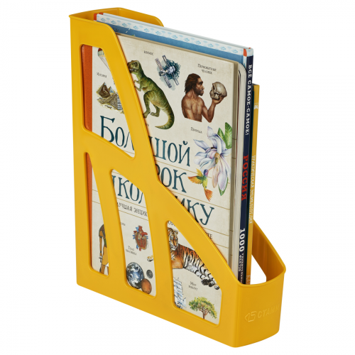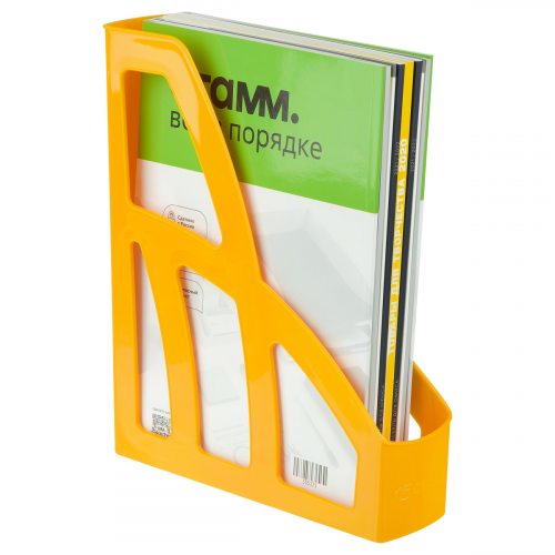 Лоток для бумаг вертикальный "СТАММ" серии "Лидер" предназначен для хранения и систематизации бумажной продукции формата А4. Оригинальный дизайн, лёгкий, устойчивый и прочный корпус. Имеет отверстие на торцевой части для удобной переноски. Изготовлен из качественного пластика. Цвет лотка - желтый. Изделие высотой 297мм, глубиной 250мм, шириной 75мм вмещает до 550 листов.