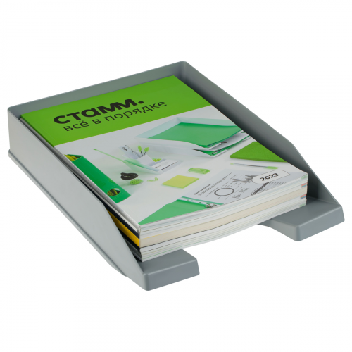 Горизонтальный лоток "СТАММ" серии Стандарт предназначен для хранения бумажной продукции формата А4. Современный дизайн, прочный и устойчивый корпус изготовлен из качественного пластика. Предусмотрена возможность установки одного лотка на другой. Изделие высотой 65мм, глубиной 348мм и шириной 252мм вмещает до 350 листов. Индивидуальная упаковка - пакет. Цвет лотка - серый.