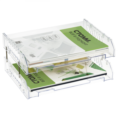 Набор из 2-х горизонтальных лотков для бумаг "СТАММ" серии "Сити" предназначен для хранения и систематизации бумажной продукции формата А4. Широкая загрузка во фронтальной части лотков облегчает изъятие документов. Прочный, устойчивый, вместительный корпус выполнен в прозрачном цвете. Лотки надёжно фиксируются друг на друге металлическими стержнями. Изделие высотой 154мм, глубиной 232мм и шириной 334мм изготовлено из качественного пластика. Вмещает до 700 листов. Набор упакован в термоусадочную пленку. Поставляется в разобранном виде.