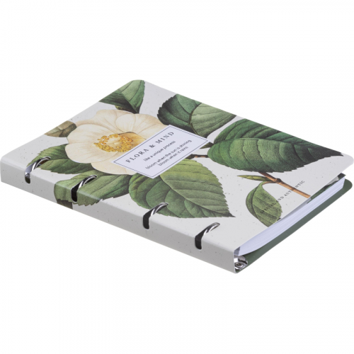 Тетрадь на кольцах со сменным блоком Be Smart Flora Камелия А5 120 листов с рисунком в клетку с перфорацией, матовая ламинацияТетрадь формата A5 (163x212 мм) с кольцевым механизмом - это стильное и удобное решение для записи конспектов, лекций и задач. Коллекция Flora сочетает живописные образы Прованса и элементы ретро, что придаёт тетради уникальную эстетику, стимулирующую творчество.Обложка выполнена из мелованного картона плотностью 500 г/кв.м с ярким цветным принтом камелии, тиснением фольгой и матовой ламинацией. Ламинация увеличивает прочность и долговечность изделия, а скруглённые уголки обложки защищают её от повреждений и помогают сохранить её внешний вид при хранении в сумке или рюкзаке.Внутренний блок состоит из 120 листов (240 страниц) белой офсетной бумаги плотностью 65 г/кв.м с клеточной линовкой и серыми линиями. Листы имеют прямые уголки, белизну 100%, а также титульный лист для удобства использования. Размер листа - 14x20 см.