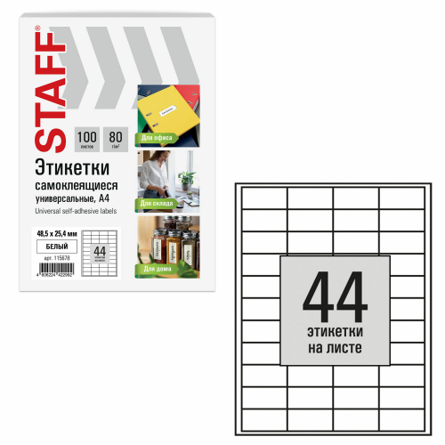 Изготовлены из самоклеящейся матовой бумаги плотностью 80 г/м2. Надежно приклеиваются к поверхности любой формы и материала. Картонная упаковка содержит 100 листов формата А4, на каждом листе – 44 этикетки размером 48,5х25,4 мм.
