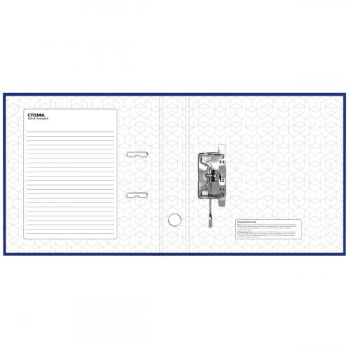 Папка-регистратор СТАММ серии «Офис» формата А4 с арочным механизмом идеальна для создания архива и экономии офисного пространства. Размер папки – 320*290*70 мм. Папка вмещает до 550 листов. Ширина корешка составляет 70 мм. Минималистичный классический дизайн: папка выполнена в насыщенном синем цвете. Изготовлена из жесткого износостойкого картона с односторонним покрытием из бумвинила. Внутреннее покрытие выполнено из бумаги. Папка имеет арочный механизм из качественного металла. Конструкция разработана с учетом всех особенностей эксплуатации. Эргономичное отверстие в корешке помогает быстро снять папку с полки. На корешке папки есть ярлык для маркировки. На внутренней стороне обложки есть поле для записи.