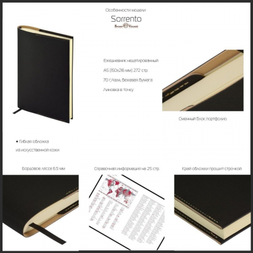 Двойное ?р? в названии ежедневника Sorrento как бы намекает на заостренную форму. Этот ежедневник прослужит очень долго, т.к. блок можно заменять по мере необходимости. Простроченная обложка снабжена большим внутренним карманом для бумаг. Используйте Sorrento как блокнот для записи или для портфолио. Шероховатая обложка недатированного ежедневника Sorrento от Bruno Visconti напоминает плотную ткань и выполнена в классическом красном цвете. На внутренней стороне обложки, помимо кармана для бумаг, предусмотрено специальное место для визиток. Для блока использована бежевая бумага плотностью 70-90 г/кв.м. Справочная информация на 25 страницах (Часовые пояса, аэропорты Европы, телефонные коды, религиозные праздники, единицы измерения, штрихкоды, буквенные коды стран, автомобильные коды РФ и СНГ, размеры одежды, греческие буквы, города миллионники, страны мира). Ежедневник упакован в картонный полукороб и термопленку. Формат А5.