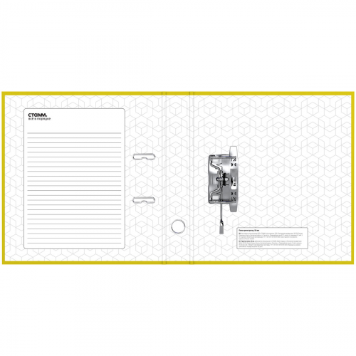 Папка–регистратор «СТАММ» серии «Стандарт» размером А4 (320*290*50 мм) с обложкой из жесткого износостойкого картона с односторонним покрытием из бумвинила. Вместимость папки – 450 листов, ширина корешка – 50 мм. Цвет – желтый. Конструкция разработана с учетом всех особенностей эксплуатации. Папка выгодно отличается надежным арочным механизмом из качественного металла, наличием кармана на корешке со сменным информационным ярлыком для маркировки, полем для записей на внутренней стороне обложки и отверстием для удобного снятия с полки. Папка предназначена для транспортировки, упорядочивания и хранения бумаг.