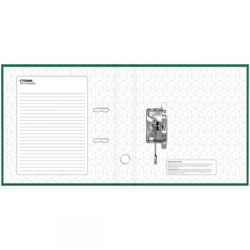 Папка-регистратор «СТАММ» серии «Стандарт» формата А4 с арочным механизмом идеальна для создания архива и экономии офисного пространства. Папка вмещает до 450 листов. Размер папки – 320*290*50 мм. Ориентация папки – вертикальная. Ширина корешка составляет 50 мм. Минималистичный классический дизайн: папка выполнена в глубоком зеленом цвете. Изготовлена из жесткого износостойкого картона с односторонним покрытием из бумвинила. Папка имеет арочный механизм из качественного металла. Конструкция разработана с учетом всех особенностей эксплуатации. Эргономичное отверстие в корешке помогает быстро снять папку с полки. На корешке папки есть карман со сменным информационным ярлыком для маркировки. На внутренней стороне обложки папка-регистратор имеет поле для записи.