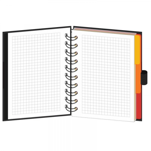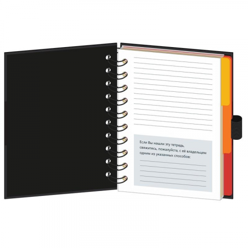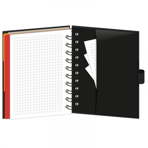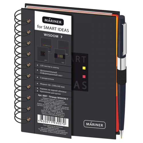 Бизнес-тетрадь Wisdom 7 (0007), формат А6, 120 листов и дополнительный информационный лист. Крепление на спирали, мелованная бумага, печать 4+0, располагается поверх верхней обложки. Обложка - 7БЦ (картон), черная с цветными вставками, твердый переплет на спирали, матовая ламинация и выборочный УФ-лак. Форзац - офсетная бумага, печать 1+0 (черный). Размеры: 100140 мм, бумага - офсет 65 г/кв.м, в клетку. 3 вертикальных картонных разделителя (красный, желтый, оранжевый), на нижней обложке с внутренней стороны кармашек для мелочей, резинка под ручку, каждое изделие упаковано в термоусадочную пленку.