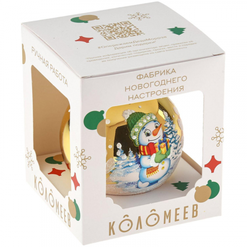 Шар новогодний Коломеев Снеговик с подарком стекло разноцветный (диаметр 8 см). Милый Снеговик создаст праздничное настроение, добавит теплоту и уют в декор вашего рождественского дерева. Блеск деталей будет гармонировать с хвойными ветвями и переливаться под светом гирлянд, создавая волшебное сияние. Он расписан вручную. Благодаря стильному дизайну и подарочной упаковке шар станет прекрасным сувениром для коллег и друзей, он порадует и детей, и взрослых. Эта рождественская покупка поможет создать незабываемые эмоции и всегда будет напоминать о том, что Новый год - время чудес.