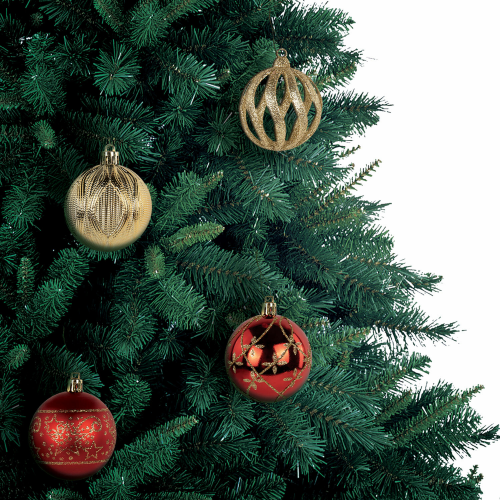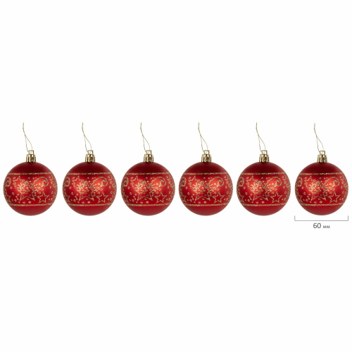 6 шаров красного цвета диаметром 6 см с золотистым рисунком с глянцевым эффектом, а также 24 нити из полиэстера золотистого цвета длиной 30 см для подвешивания шаров.