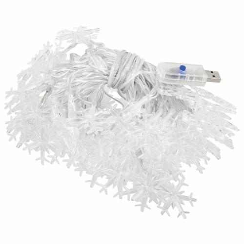 Электрическая светодиодная гирлянда представляет собой светодиоды, соединенные между собой электрическим проводом. Тип конструкции – "Нить". Длина рабочей части гирлянды составляет 10 м. Количество светодиодных ламп в виде "снежинок" – 80 шт. Размер снежинки – 3,5 см. Лампы сделаны на основе технологии LED, которая является более безопасной и эффективной по сравнению с лампой накаливания.