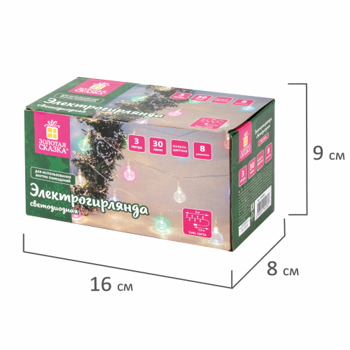 Светодиодные гирлянды ЗОЛОТАЯ СКАЗКА – это яркие, красочные и эффектные спутники любого праздничного события. Мягкий и вместе с тем насыщенный свет этих украшений позволяет использовать их для светового декорирования интерьеров домов, административных и развлекательных учреждений. Длина рабочей части гирлянды составляет 3 м. Количество светодиодов – 30 шт. Расстояние между светодиодами – 10 см.