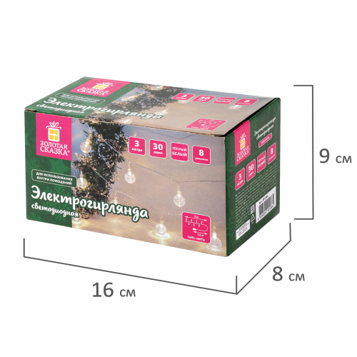 Длина рабочей части гирлянды составляет 3 м. Количество светодиодов – 30 шт. Расстояние между светодиодами – 10 см.