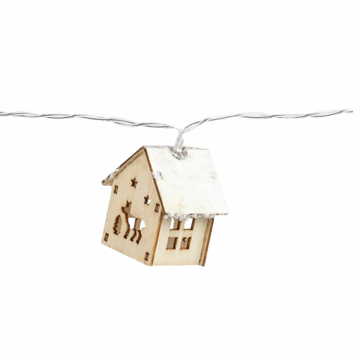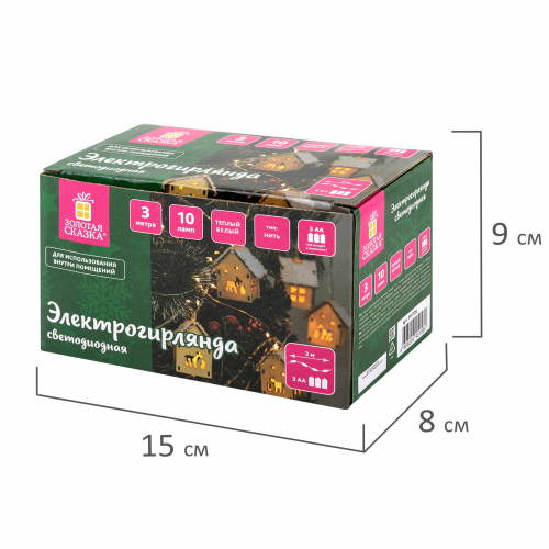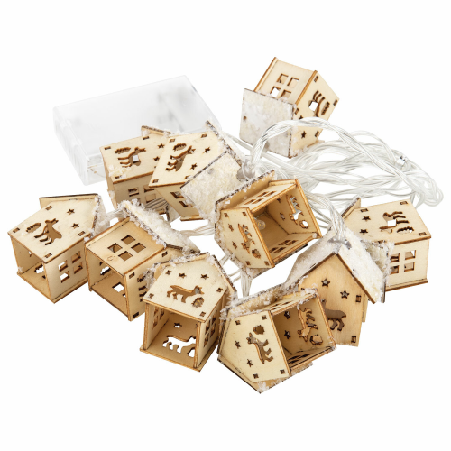 Электрическая светодиодная гирлянда представляет собой светодиоды, соединенные между собой электрическим проводом. Тип конструкции "Нить". Длина рабочей части гирлянды составляет 2 м. Количество светодиодных ламп в виде "деревянных домиков" – 10 шт. Размер домиков – 3х2,8х4,5 см. Лампы сделаны на основе технологии LED, которая является более безопасной и эффективной по сравнению с лампой накаливания.