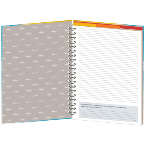 Бизнес-тетрадь Be Happy (0002-04), формат А4, 120 листов и дополнительный информационный лист. Крепление на спирали, мелованная бумага, печать 4+0, располагается поверх верхней обложки. Обложка - 7БЦ (картон), разноцветная (голубой, оранжевый), твердый переплет на спирали, печать 4+0, матовая ламинация и выборочный УФ-лак. Форзац - офсетная бумага, печать 1+0 (серый). Размеры: 200х274 мм, бумага - офсет 65 г/кв.м, в клетку. 3 горизонтальных картонных разделителя (красный, желтый, оранжевый), каждое изделие упаковано в термоусадочную пленку.