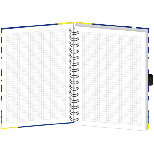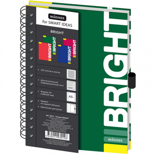 ?Бизнес-тетрадь Bright (0014-02), формат А5, 120 листов, дополнительный информационный лист. Крепление на спирали, мелованная бумага, печать 4+0, располагается поверх верхней обложки. Обложка ??-?? 7БЦ (картон), зеленая, твердый переплет на спирали, глянцевая ламинация. Форзац ??-?? офсетная бумага, печать 1+0 (серый). Размеры: 148???205 ??мм, бумага ??-?? офсет 65 г/кв.м, в клетку, на нижней обложке с внутренней стороны кармашек для мелочей, резинка под ручку, каждое изделие упаковано в термоусадочную пленку.?