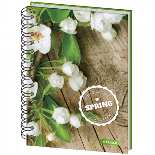 Бизнес-тетрадь Spring (0018), формат А5, 120 листов, дополнительный информационный лист. Крепление на спирали, мелованная бумага, печать 4+0, располагается поверх верхней обложки. Обложка - 7БЦ (картон), твердый переплет на спирали, матовая ламинация и выборочный УФ-лак, 4 дизайна. Форзац - офсетная бумага, печать 1+0 (серый). Размеры: 148×205 мм, бумага - офсет 65 г/кв.м, 1 картонный разделитель, каждое изделие упаковано в термоусадочную пленку.Внимание! Товар поставляется в различных вариантах дизайна/цвета без возможности выбора.
