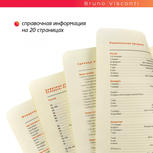 Недатированный ежедневник Bruno Visconti 'Boston' формата A5 с гибкой (flex) обложкой заслуживает особого внимания. Фактурный материал обложки придает ежедневнику благородства, а цветной срез - дерзости и яркости одновременно. Двойное ляссе для быстрой навигации - важная деталь, она выгодно выделяет этот ежедневник на фоне остальных, повторяя все его цветовые решения, играя на контрасте с ними. Держатель для ручки в виде петли - дополнительная приятная функциональная опция. Бумажный блок выполнен из бежевой бумаги повышенной плотности. Он содержит страницу для персональных данных, справочную информацию и блок для записей в линовку с указанием временных интервалов в один час. Эстеты и ценители интересных решений оценят ежедневник 'Boston' по достоинству.