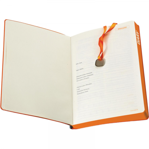 Ежедневник недатированный Bruno Visconti Mercury. Формата A5, размер изделия - 145x213 мм. Обложка оранжевого цвета выполнена из искусственной кожи с оранжевым обрезом. Блок: недатированный, 136 листов (272 страницы) высококачественной белой бумаги (плотность 70 г/кв.м) в линейку, печать в 2 цвета. Двойная оранжевая закладка-ляссе с шильдом. Содержит информационно-справочный блок - международные коды городов мира, европейские аэропорты, цифровые коды ГИБДД, среднемесячная температура, телефоны первой необходимости, штриховой код, неметрические единицы, междугородные коды России и мира, денежные единицы, размеры одежды. Подходит для любого вида тиснения.