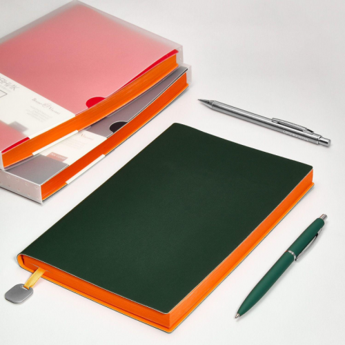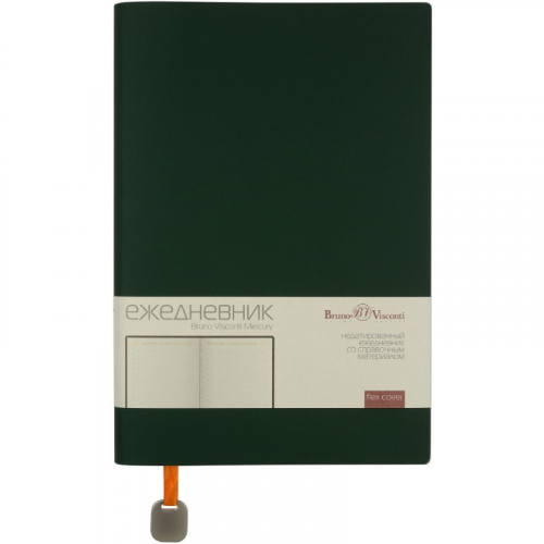 Ежедневник недатированный Bruno Visconti Mercury. Формата A5, размер изделия - 145x213 мм. Обложка темно-зеленого цвета выполнена из искусственной кожи с оранжевым обрезом. Блок: недатированный, 136 листов (272 страницы) высококачественной белой бумаги (плотность 70 г/кв.м) в линейку, печать в 2 цвета. Двойная оранжевая закладка-ляссе с шильдом. Содержит информационно-справочный блок - международные коды городов мира, европейские аэропорты, цифровые коды ГИБДД, среднемесячная температура, телефоны первой необходимости, штриховой код, неметрические единицы, междугородные коды России и мира, денежные единицы, размеры одежды. Подходит для любого вида тиснения. Ежедневник продается в пластиковой коробке слив-бокс.