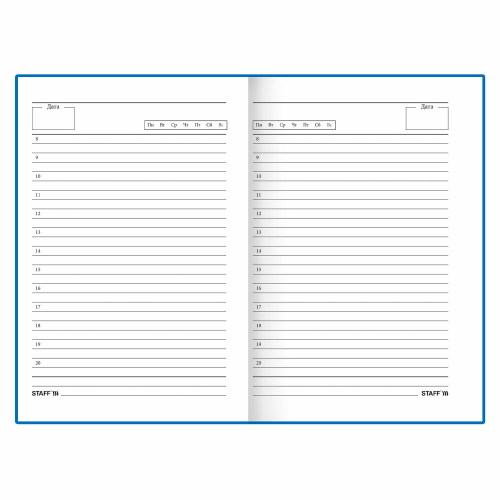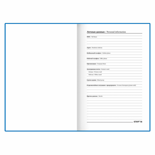 Внутренний блок включает 160 листов белой бумаги плотностью 65 г/м2. Благодаря стандартному формату А5 (145х215 мм) ежедневник удобно использовать как в офисе, так и на выездных деловых встречах. Твердая обложка покрыта матовой пленкой. Печать внутреннего блока выполнена в одну краску.