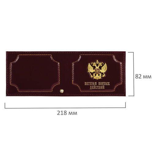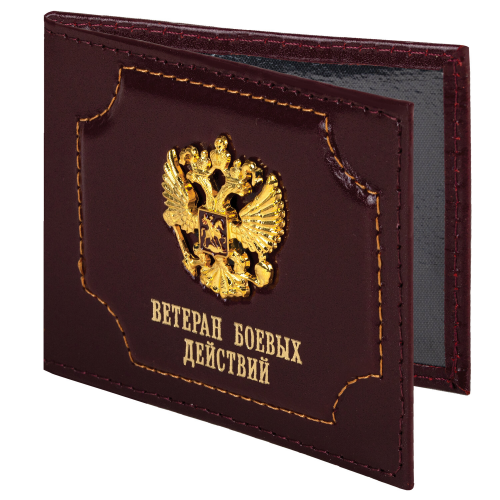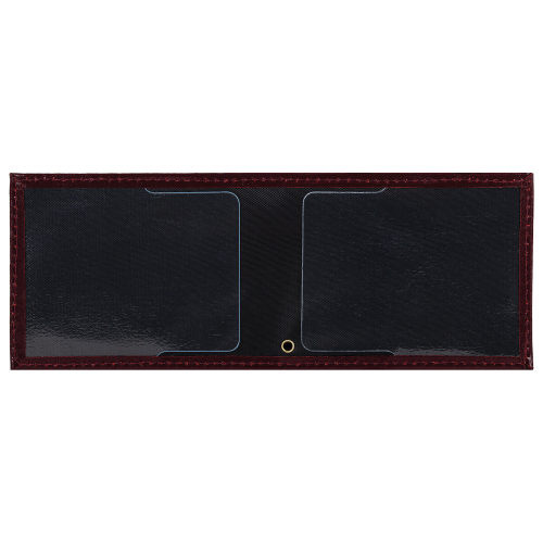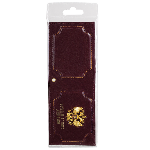 Модель выполнена из натуральной гладкой кожи бордового цвета, украшена золотой металлической кокардой "Герб России". Имеет один карман. Благодаря компактным размерам (7х82х109 мм) удобно всегда носить с собой. Дополнительно в обложке имеется металлический люверс для крепления, можно прицепить страховочную цепочку.