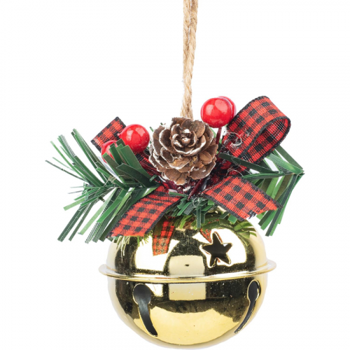 Новогоднее украшение Magic Time Золотой бубенчик металл/пластик золотистое (высота 6 см). Новогоднее украшение в виде золотого колокольчика прекрасно дополнит собой праздничный интерьер или новогоднюю елку и просто будет радовать окружающих. Своим универсальным дизайном украшение локанично подчеркнет убранство дома, подарит ощущение сказки и волшебства. Изделие выполнено из металла, отделано пластиковыми ягодками и джутовой лентой.