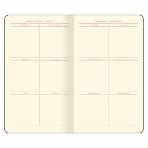 Мягкая, но при этом прочная обложка из экокожи приятна на ощупь. Дизайн форзаца и цветной срез являются лаконичным продолжением обложки. Ориентация – вертикальная.