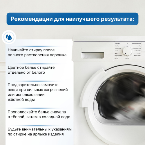 Стиральный порошок для стирки в автоматических стиральных машинах - современное решение, позволяющее экономить собственное время и затраты воды. Подходит для замачивания и стирки изделий из хлопчатобумажных, льняных и синтетических волокон.