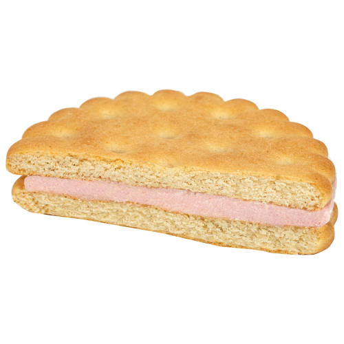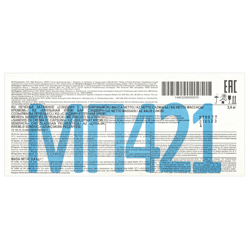 Состав: мука пшеничная в/с, сахар, жир кондитерский (рафинированные дезодорированные растительные масла в натуральном и модифицированном виде (фракции пальмового масла,пальмовое масло,пальмоядровое масло),эмульгатор лецитин соевый ), жир кондитерский (рафинированные дезодорированные растительные масла в натуральном и модифицированном виде, в том числе соевое; эмульгаторы: моно- и диглицириды жирных кислот, соевый лецитин; ароматизатор, краситель бета- каротин, антиокислители: аскорбиновая кислота, альфа-токоферол), вода, сыворотка молочная сухая, разрыхлители (гидрокарбонат аммония,гидрокарбонат натрия), соль, эмульгатор лецитин соевый,ароматизаторы, краситель натуральный -концентрированный сок черной моркови (концентрированный сок черной моркови, регулятор кислотности - лимонная кислота), регулятор кислотности кислота лимонная, антиокислитель пиросульфит натрия, концентрированный сок клубники. Может содержать следы арахиса, яичных продуктов.
