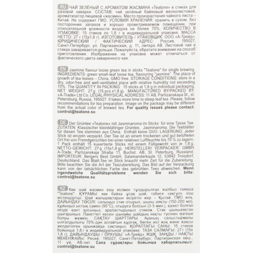 Чай зеленый Teatone Jasmine 15 стиков. Сочетание зеленого чая с нежными цветами жасмина несет в себе идеальную гармонию пользы, легкого вкуса и головокружительного аромата. Лучший напиток для бодрости и вдохновения. Благодаря вакуумной упаковке каждого стика при извлечении не оставляет капель и брызг.Состав: чай зеленый байховый мелкий, ароматизатор пищевой 'жасмин'.Способ приготовления: залейте стик горячей водой, дайте чаю настояться 3-5 минут.Количество пакетиков в упаковке: 15 штук.Тип упаковки: картонная коробка.Условия хранения: хранить в чистом, хорошо вентилируемом помещении без посторонних запахов при относительной влажности воздуха не более 70%.Страна производства: Россия.