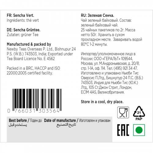 Чай зеленый Newby Green Sencha 25 пакетиков. Классический зеленый чай, изготовленный по традиционной японской технологии. Молодые листья собирают ранней весной и обрабатывают паром, чтобы придать чаю нежный характер. Золотисто-зеленый настой со свежим рисовым ароматом и мягким, шелковистым послевкусием.Состав: чай зеленый.Способ приготовления: заварить горячей водой 70-80 градусов и дать настояться 1-2 минуты.Количество пакетиков в упаковке: 25 штук.Тип упаковки: картонная коробка.Условия хранения: хранить в чистом, хорошо вентилируемом помещении без посторонних запахов при относительной влажности воздуха не более 70%.Страна производства: Индия.