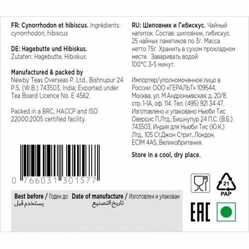 Чай фруктовый травяной Newby 25 пакетиков (шиповник, гибискус). Насыщенный ярко-красный настой с удивительно сбалансированным сладким и немного вяжущим вкусом. Купаж Шиповник и Гибискус Newby является богатым источником витамина С, обладает успокаивающим и противовоспалительным свойствами. Тизан состоит исключительно из натуральных ингредиентов и не содержит кофеин, поэтому станет идеальным напитком для взрослых и детей, как в горячем, так и в холодном виде. Освежающий настой темно-красного цвета с фруктовой и лимонной нотами во вкусе.Состав: шиповник и гибискус.Способ приготовления: заварить чайный пакетик в чашке или заварочном чайнике кипяченой водой и настоять 3-5 минут.Количество пакетиков в упаковке: 25 штук. Тип упаковки: картонная коробка.Условия хранения: хранить в чистом, хорошо вентилируемом помещении без посторонних запахов при относительной влажности воздуха не более 70%.Страна производства: Индия.