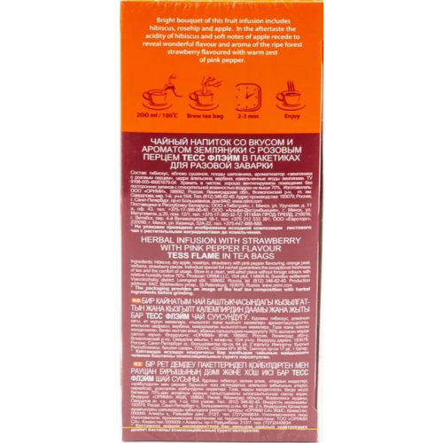 Чай ягодный фруктовый Tess Flame 25 пакетиков (земляника, розовый перец). Тесс Флэйм. Травяной чай на основе гибискуса, шиповника и яблока с цедрой апельсина, вербеной и кусочками клубники. Пламенная феерия вкуса! Искра гибискуса зажигает веселые огоньки шиповника, мяты и апельсина, увлекая в яркий карнавал вкуса Тесс Флейм. Солнечный аромат спелой клубники заряжает озорным летним настроением.Состав: гибискус, яблоко сушеное,плоды шиповника, ароматизатор 'земляника с розовым перцем', цедра апельсина, вербена, измельченные ягоды земляники.Способ приготовления: заварить чайный пакетик в чашке или заварочном чайнике кипяченой водой и настоять 4-6 минут.Количество пакетиков в упаковке: 25 штук. Тип упаковки: картонная коробка.Условия хранения: хранить в чистом, хорошо вентилируемом помещении без посторонних запахов при относительной влажности воздуха не более 70%.Страна производства: Россия.