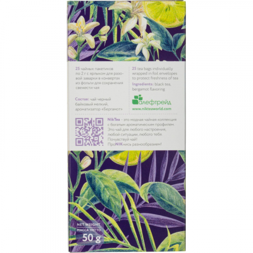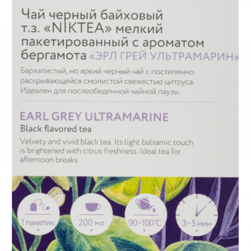 Чай черный Niktea Earl Grey Ultramarine 25 пакетиков (бергамот). Пакетированный чай Niktea Эрл Грей Ультрамарин черный байховый ароматизированный с ароматом бергамота идеален для послеобеденной чайной паузы. Коллекция Niktea разработана командой экспертов, имеющих богатый опыт в чайной индустрии. Во время ее создания выбирались самые надежные поставщики из Европы и стран происхождения чая, а в линейку включили не только топовые аутентичные позиции, но и новые интересные рецептуры в традициях современной чайной миксологии. В линейках пакетированного чая представлены все основные группы вкусов - от классического черного и зеленого чая до ароматизированных, фруктовых и травяных композиций. Необычная упаковка с модным авторским дизайном создает яркий и запоминающийся стиль, а интересные коктейльные рецептуры дают возможность экспериментировать со вкусами. Фильтр-бумага для пакетированного чая Niktea поставляется одним из мировых лидеров по производству специальных высококачественных бумаг - компанией Glatfelter. Чайная фильтровальная бумага Glatfelter представляет собой специально разработанный микс из натурального волокна абаки и целлюлозы. Такая фильтр-бумага обеспечивает быструю и качественную экстракцию чая, но в то же самое время не пропускает даже самые мелкие частицы чайного листа в настой. В результате вы получаете превосходный цвет, богатый вкус и насыщенный аромат чая.Состав: чай черный байховый мелкий высший сорт, ароматизатор пищевой 'бергамот'.Способ приготовления: залейте чайный пакетик горячей воды, дайте чаю настояться 3-5 минут.Количество пакетиков в упаковке: 25 штук.Тип упаковки: картонная коробка.Условия хранения: хранить в чистом, хорошо вентилируемом помещении без посторонних запахов при относительной влажности воздуха не более 70%.Страна производства: Россия.