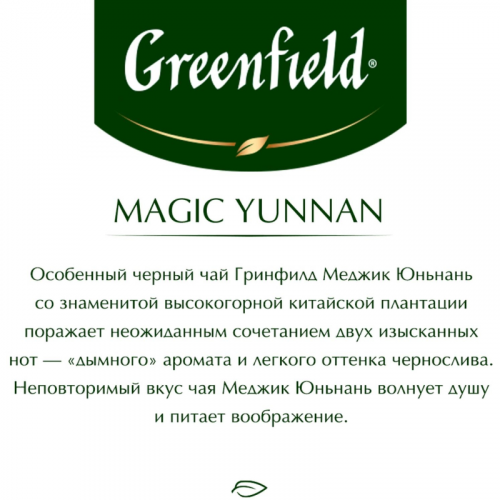 Чай черный Greenfield Magic Yunnan 100 пакетиков. Великолепный черный чай, выращенный на знаменитых высокогорных плантациях китайской провинции Юньнань, поражает неожиданным сочетанием двух изысканных вкусовых нот - ?дымного? аромата и легкого оттенка чернослива. Неповторимый вкус чая Magic Yunnan волнует душу и питает воображение.Состав: чай черный байховый китайский. Способ приготовления: залейте чайный пакетик горячей воды, дайте чаю настояться 3-5 минут.Количество пакетиков в упаковке: 100 штук.Тип упаковки: картонная коробка.Условия хранения: хранить в чистом, хорошо вентилируемом помещении без посторонних запахов при относительной влажности воздуха не более 70%.Страна производства: Россия.