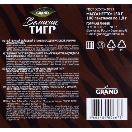 Чай черный Grand Великий Тигр 100 пакетиков без ярлычка. Чай с насыщенным цветом и умеренно терпким вкусом, который дарит заряд бодрости и энергии. Черный чай Grand ?Великий Тигр? из Индии - это изысканный сорт черного чая, собранный на солнечных плантациях этой страны. Чай в пакетиках для одноразового заваривания отличается насыщенным вкусом и ароматом. Наслаждайтесь чашкой этого бодрящего чая, созданного нашими опытными специалистами!Состав: индийский черный чай. Способ приготовления: залейте чайный пакетик горячей воды, дайте чаю настояться 3-5 минут.Количество пакетиков в упаковке: 100 штук.Тип упаковки: картонная коробка.Условия хранения: хранить в чистом, хорошо вентилируемом помещении без посторонних запахов при относительной влажности воздуха не более 70%.Страна производства: Россия.