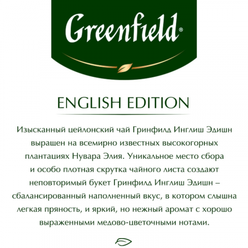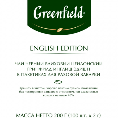 Чай черный Greenfield English Edition 100 пакетиков. Изысканный цейлонский чай Greenfield English Edition выращен на всемирно известных высокогорных плантациях Нувара Элия. Уникальное место сбора и особо плотная скрутка чайного листа создают неповторимый букет Greenfield English Edition - сбалансированный наполненный вкус, в котором "слышна" легкая пряность, и яркий, но нежный аромат с хорошо выраженными медово-цветочными нотами. Состав: черный цейлонский байховый чай. Способ приготовления: залейте чайный пакетик горячей воды, дайте чаю настояться 3-5 минут. Количество пакетиков в упаковке: 100 штук. Тип упаковки: картонная коробка. Условия хранения: хранить в чистом, хорошо вентилируемом помещении без посторонних запахов при относительной влажности воздуха не более 70%. Страна производства: Россия.