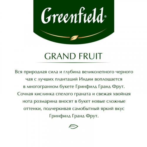 Чай черный Greenfield Grand Fruit 25 пакетиков (розмарин, гранат). Вся природная сила и глубина великолепного черного чая с лучших плантаций Индии воплощается в многогранном букете Greenfield Grand Fruit. Сочная кислинка спелого граната и свежая хвойная нота розмарина вносят в букет новые сложные оттенки, подчеркивая самобытный яркий вкус Greenfield Grand Fruit.Состав: чай черный байховый, ароматизатор 'гранат', гибискус, розмарин, кожура плодов граната.Способ приготовления: залейте чайный пакетик горячей воды, дайте чаю настояться 7-9 минут.Количество пакетиков в упаковке: 25 штук.Тип упаковки: картонная коробка.Условия хранения: хранить в чистом, хорошо вентилируемом помещении без посторонних запахов при относительной влажности воздуха не более 70%.Страна производства: Россия.